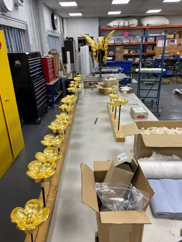 Here you can see the lantern arms, primed in the grey zinc coating, in the spray room.