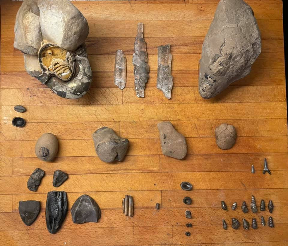 Gary’s personal best find is a complete turtle, a very rare find. He was walking along and he spotted something a little orange, that looked like it didn’t belong there. All that was exposed was a tiny corner, and he dug it out. He’s also found a whole trunk of a tree preserved in the clay. That stayed where it was! Others have found fish skulls of over a foot long, but the best thing perhaps is a large bony toothed skull, found by another local fossil enthusiast.